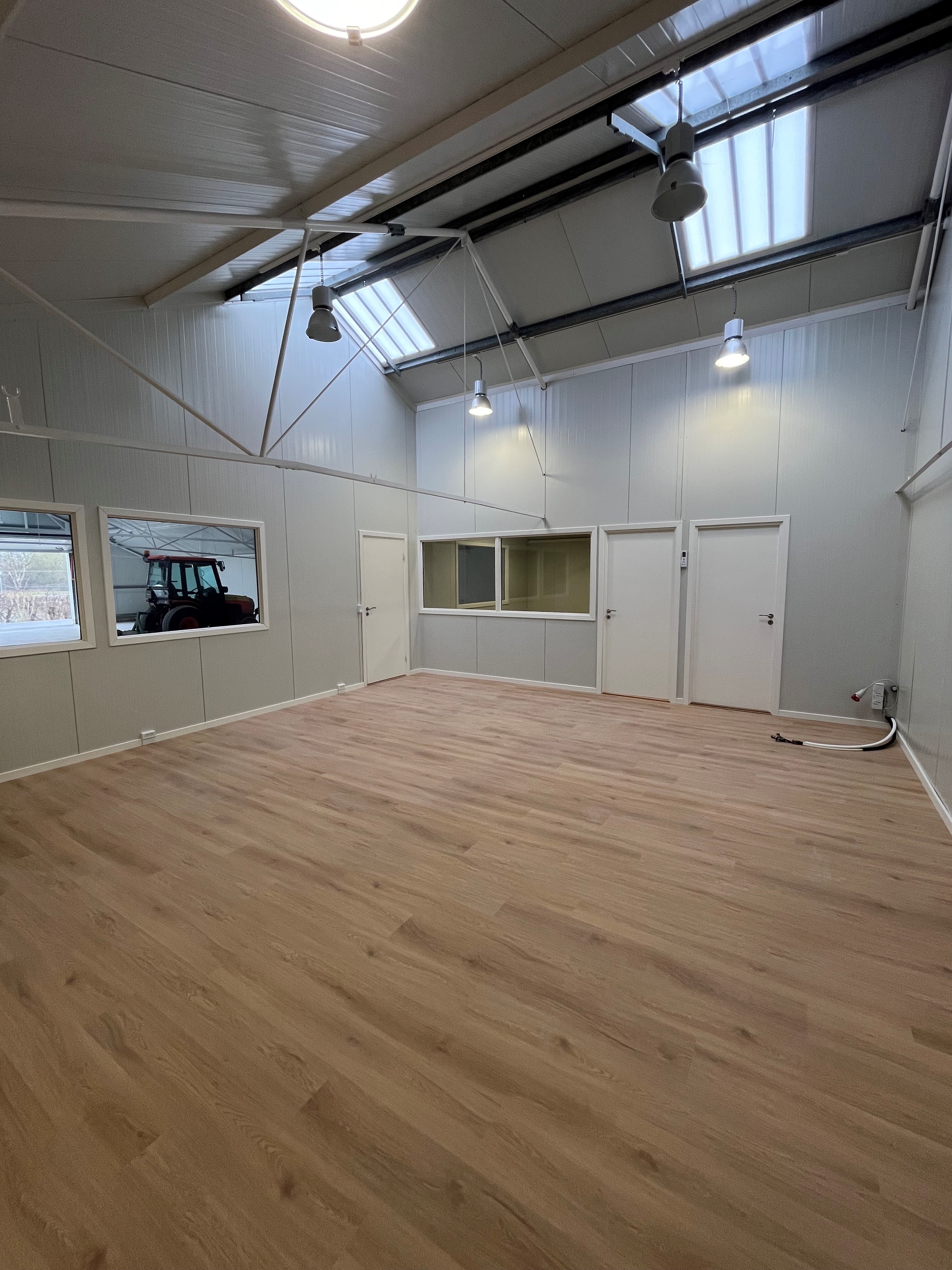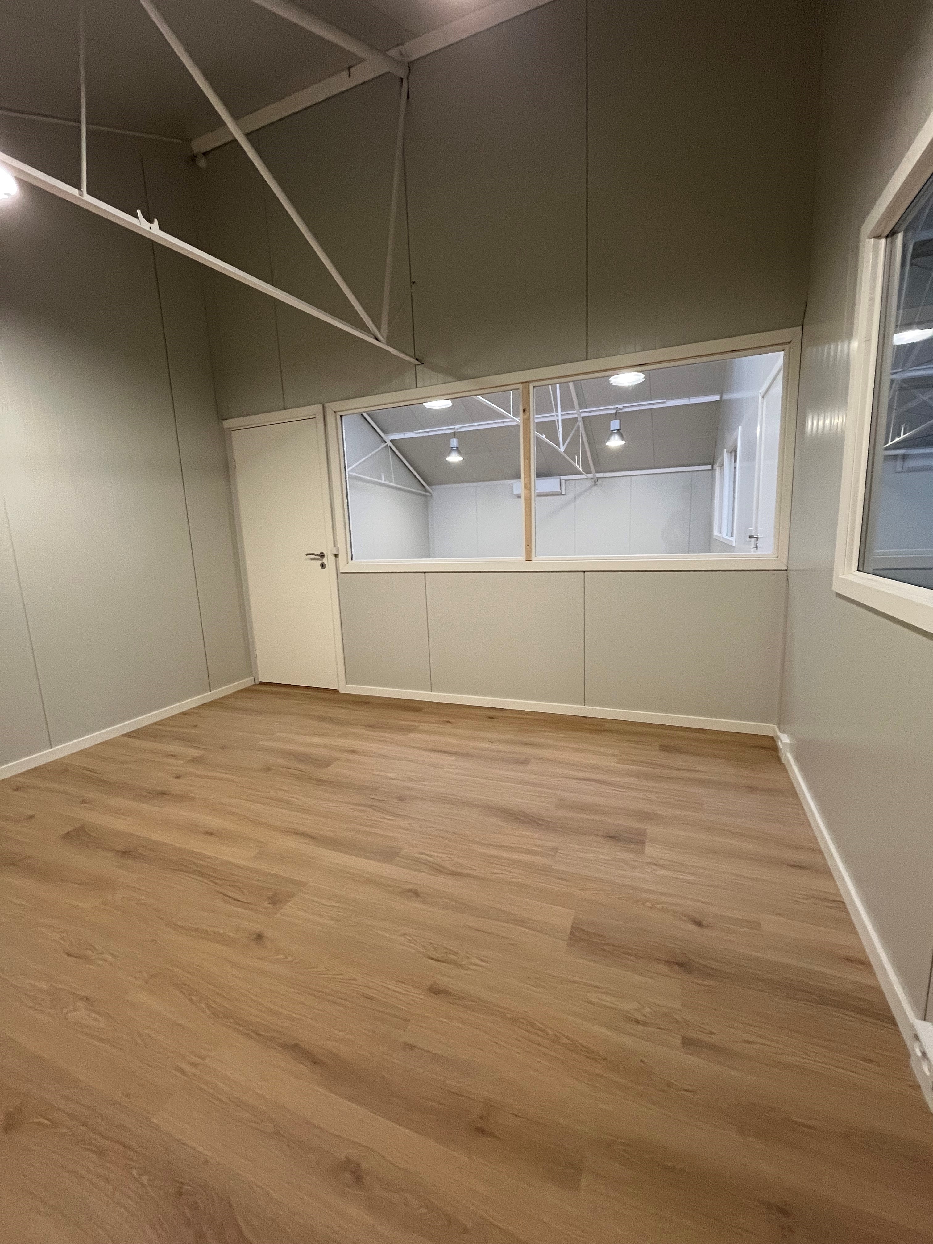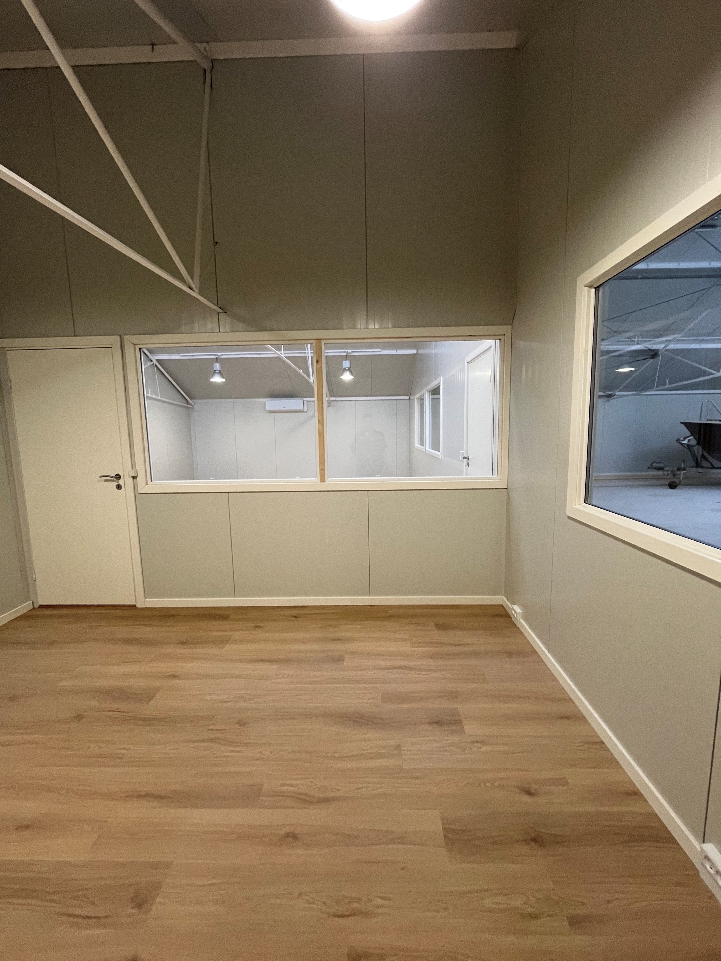 Kontorområdet er moderne og opdelt i to separate rum, hvilket giver gode muligheder for både administration, møder og daglig drift. Der er desuden visuel kontakt mellem kontor og lager via vinduesparti.